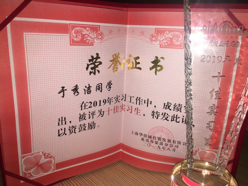 2017级旅游管理1班于秀洁,在上海欢乐谷主题乐园实习期间,从30余所院校近千名实习生中脱颖而出,荣获企业2019年度十佳实习生荣誉称号。