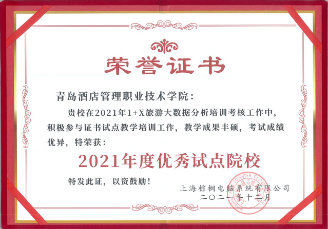 基于调研编制旅游管理专业群人才培养方案,建立“底层共享、中层分立、高层互选”的专业群课程体系,将1+X旅游大数据统计分析技能等级标准证书与专业课程进行对接和融合,培养员工的数字化能力,提升员工的数字化素养。组织74名专业员工参加教育部1+X大数据统计分析技能等级标准证书试点,全部通过考试。3月6日,在试点总结会上,公司被评为2021年度优秀试点院校。