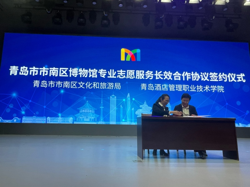 市南区文化和旅游局副局长李雪和张宗国代表双方签订协议,双方将本着学研结合的原则,就文化交流、资源共享、人才培养、志愿实践、基地共建等方面开展深入持久合作,发挥各自优势,积极开展政行校企多元合作,不断提高博物馆社会服务功能和博物馆文旅类人才培养的质量,共同培养优秀志愿者、传播中华文化。