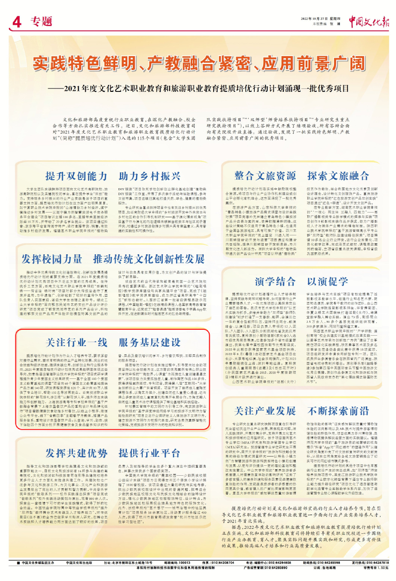 此次入选“文化艺术职业教育和旅游职业教育提质培优行动计划优秀成果”是“双高计划”建设发展和课程提质培优计划取得的又一标志性成果,得到《中国文化报》、中国艺术头条、腾讯网等多家媒体的报道。