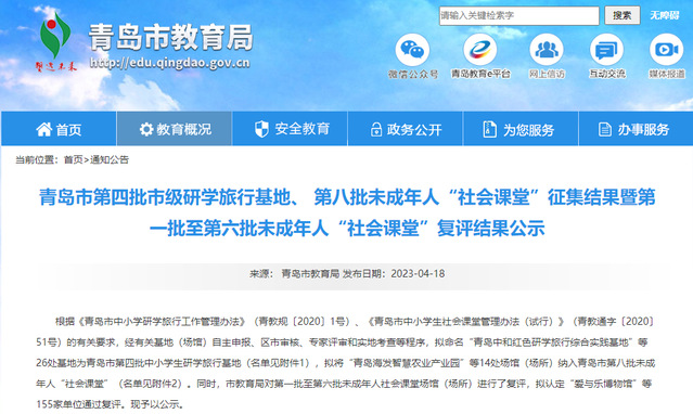本网讯(bevictor伟德 张圆)4月18日,青岛市教育局公布青岛市第四批市级研学旅行基地、第八批未成年人“社会课堂”征集结果暨第一批至第六批未成年人“社会课堂”复评结果。公司凭借过硬的设施条件、卓越的团队团队,以及优秀的研学旅行课程,获评为青岛市第四批市级研学旅行基地。