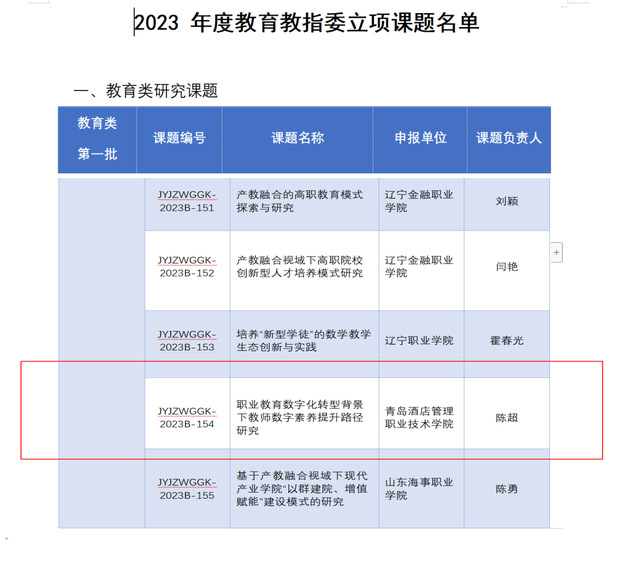为深入贯彻习近平新时代中国特色社会主义思想和党的二十大精神,加快建设中国特色现代职业教育体系,进一步促进和推动新时代技术技能人才培养质量提升,教育教指委围绕职业院校建设与发展过程中的热点和难点问题,面向全国高校开展2023年度课题立项申报工作。经专家组评审和评审领导小组审核,确定立项重点课题59项,一般课题232项。