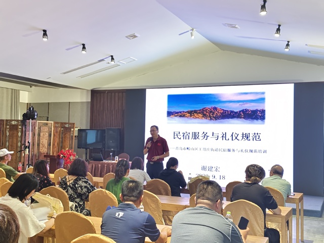 此次培训不仅内容丰富,包括民宿案例分析、乡村旅游与民宿发展现状分析、国家标准解读、服务礼仪规范、服务质量提升等多个领域。还组成了强大团队阵容,包括博士、教授,为从业者提供了前沿的理论知识和实际操作指导。此外,培训项目还协助王哥庄街道设计、组织了一场民宿比赛,不仅提高了从业者的专业技能,还激发了他们的创新潜力,增强了竞争力。