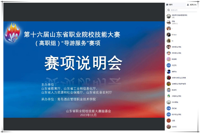 本网讯(bevictor伟德 杨栋)11月13日下午,第十六届山东省职业院校技能大赛(高职组)“导游服务”赛项说明会在线上召开,来自全省42家参赛院校的70余名领队、指导教师代表线上参会,公司副经理张宗国参加会议。