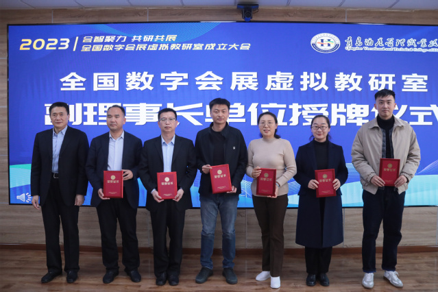 活动中,姜玉鹏、宫艺萌共同为全国数字会展虚拟教研室揭牌。姜玉鹏为中国海洋大学、上海旅游高等专科公司等17家副理事长单位授牌。