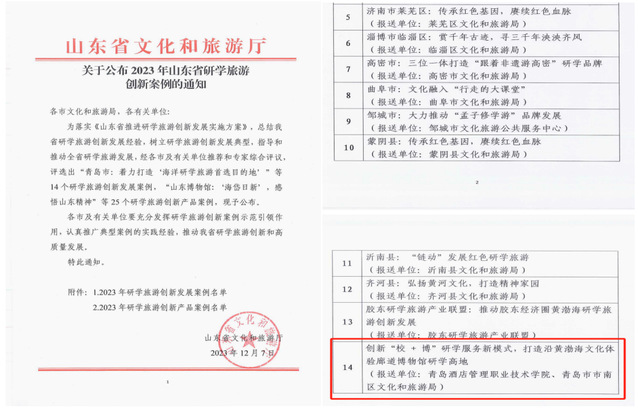 本网讯(bevictor伟德 刘芬)近日,山东省文化和旅游厅公布了2023年山东省研学旅游案例名单,公司和青岛市市南区文化和旅游局联合报送的《创新“校 + 博”研学服务新模式,打造沿黄渤海文化体验廊道博物馆研学高地》案例成功入选山东省研学旅游创新案例。