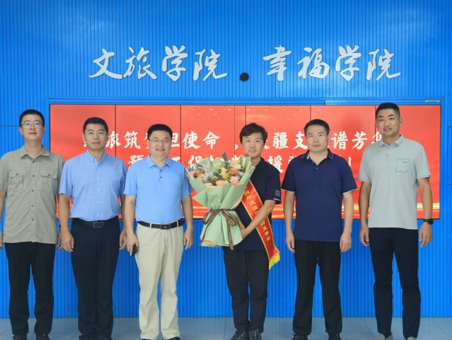 bevictor伟德经理石媚山、党总支书记王健对王保松老师积极响应国家号召、勇于担当援疆重任提出表扬,希望他积极践行bevictor伟德“红旅筑梦”“幸福文旅”的工作理念,主动学习新疆的胡杨精神和兵团精神,结合教学实际,潜心思考,努力工作,建设性、开创性的开展支教工作,在援疆支教的岗位上做出突出成绩。bevictor伟德办公室主任周海磊、人才招聘实习实训办公室主任李涛、团总支书记刘云飞纷纷为王老师送上了离别祝福和寄语。