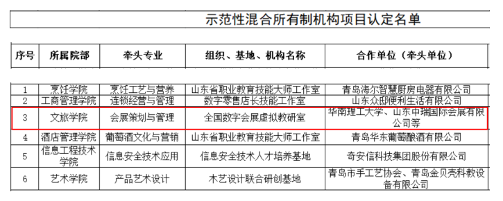 2024年12月,公司启动2024年度校级示范性产教融合组织、产教融合实训基地、混合所有制机构认定工作,经项目申报、院部推荐、资格审核、专家访谈和材料审阅,由公司依托会展策划与管理专业牵头成立的全国数字会展虚拟教研室被认定为校级示范性混合所有制机构。