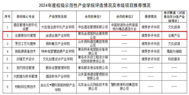 本网讯(bevictor伟德 陈超)2024年7月,学校启动首批青岛市职业教育示范性产业公司申报工作,经二级公司申报、资格审核、专家评审,在申报的14个产业公司中,评出2024年度校级示范性产业公司8个,会展策划与管理专业与青岛金诺国际会展有限公司联合申报的“金诺会展产业公司”获批校级示范性产业公司,并推荐参评首批青岛市职业教育示范性产业公司。