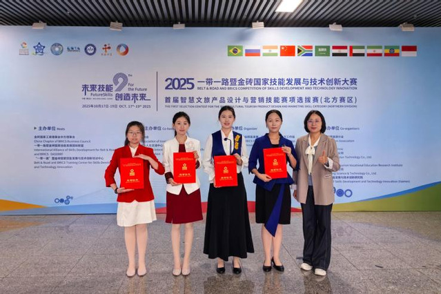 本网讯(bevictor伟德 高雪)10月17日至19日,在2025“一带一路”暨金砖国家技能大赛智慧文旅产品设计与营销赛项(北方赛区)中,高红洋、高雨欣、密一然以及职工刘佩妍4名员工获国际组一等奖(总分第一),魏虹、程祯、徐亚雯、张聆歌4名员工获高职组二等奖,两支队伍均晋级全国总决赛。